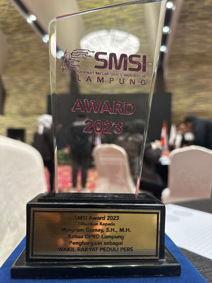 Mewakili seluruh angggota DPRD Provinsi Lampung, Ketua Dewan Perwakilan Rakyat Daerah (DPRD) Provinsi Lampung Mingrum Gumay SH., MH terima penghargaan award tahun 2023 dari Serikat Media Siber Indonesia (SMSI) Provinsi Lampung dalam rangka pelantikan pengurus baru periode 2022-2027.