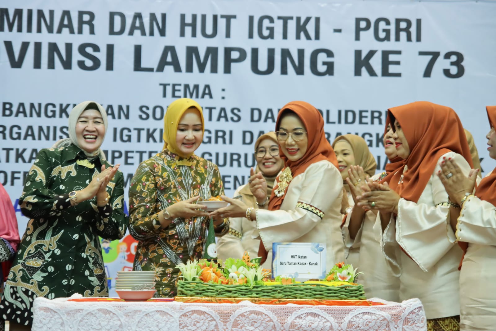 Bandar Lampung–Bunda PAUD Provinsi Lampung, Riana Sari Arinal diwakili oleh Ketua Pokja Bunda Paud Provinsi Lampung Rusdiana Adi Erlansyah, membuka Seminar dan HUT Ikatan Guru Taman Kanak-Kanak Indonesia (IGTKI) – PGRI ke-73 bertempat di Balai Keratun Lt.III, Selasa (11/07/2023)