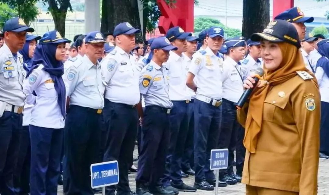 Walikota Bandar Lampung, Hj. Eva Dwiana memberikan arahan & bimbingan kepada Jajaran Pegawai Dinas Perhubungan (DisHub) Di Halaman Kantor Dinas Perhubungan Kota Bandar Lampung. Selasa (14/01/2025).