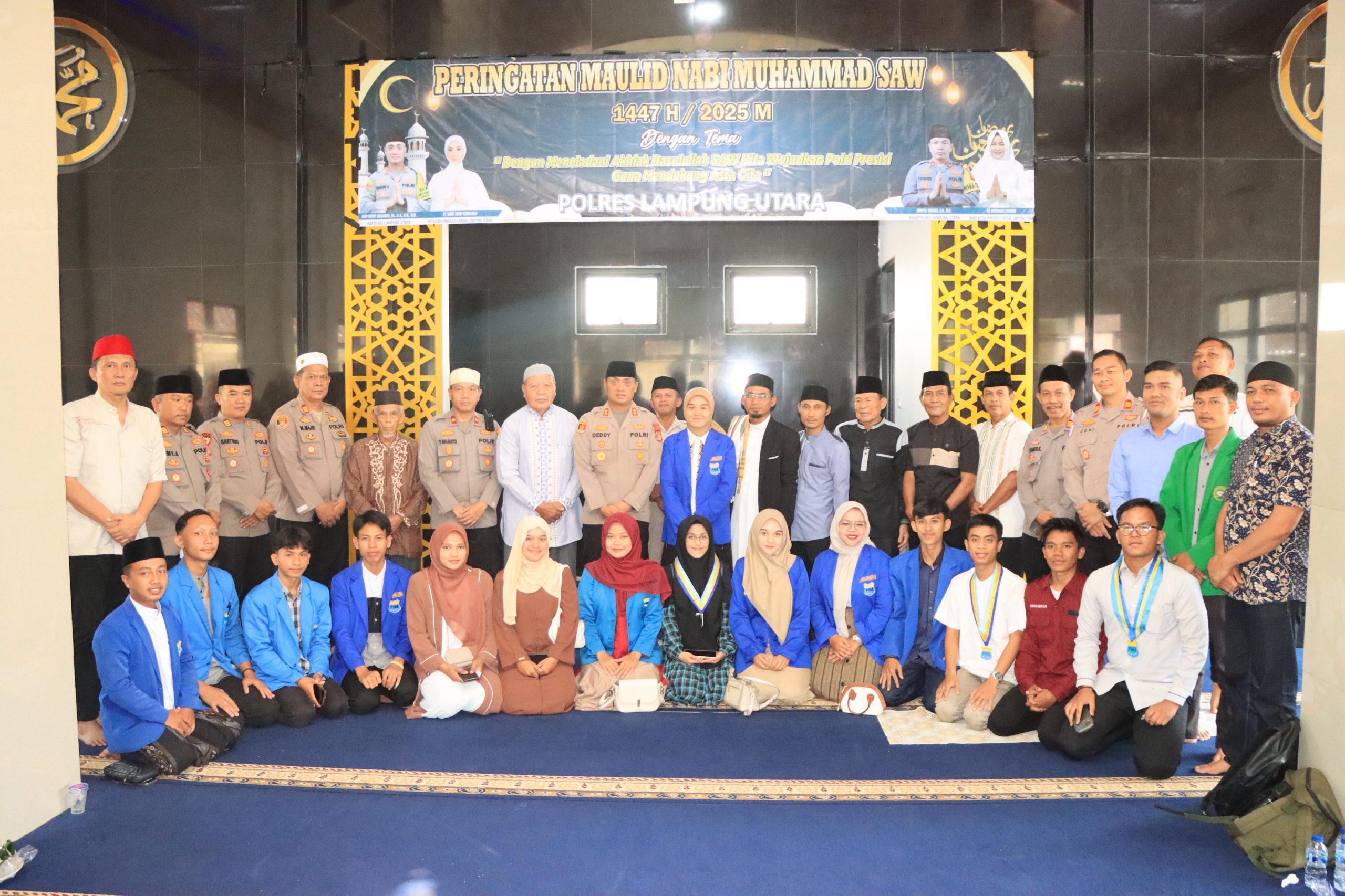Polres Lampung Utara Bersama lampung Utara – Polres Lampung Utara Melaksanakan kegiatan Peringatan Maulid Nabi Muhammad SAW dan Pengajian Istighosah Bersama Persatuan Mahasiswa Islam Indonesia (PMII) Kabupaten Lampung Utara di Masjid Al- Fachri Polres setempat, Kamis (4/9/25).