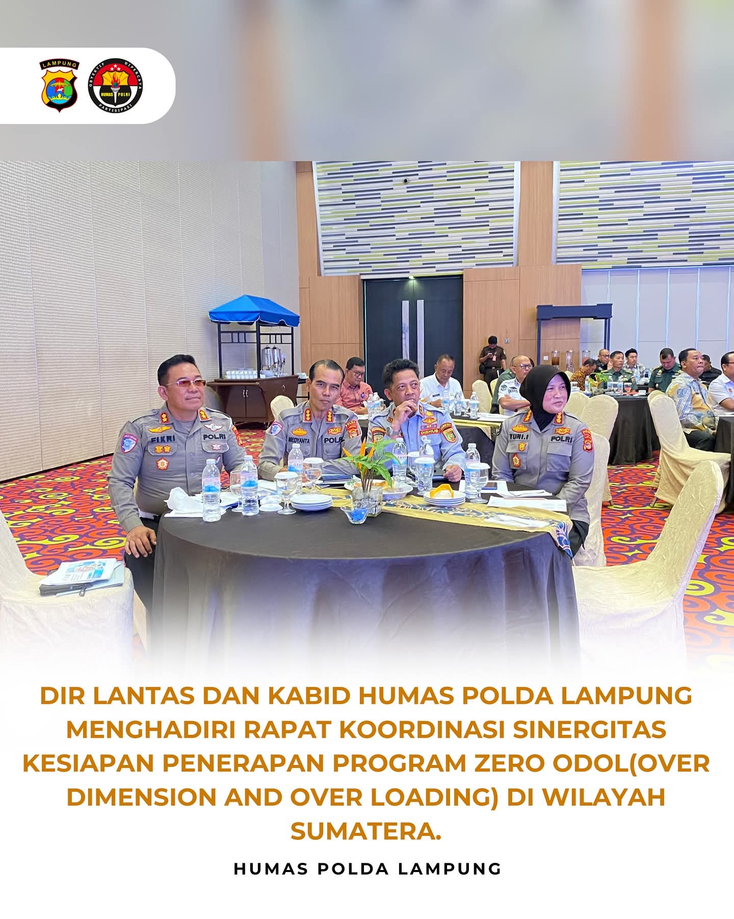 Kamis (06/11/2025), Dir Lantas Polda Lampung Kombes Pol Medyanta, S.I.K. dan Kabid Humas Polda Lampung Kombes Pol Yuni Iswandari Yuyun, S.I.K., M.H., menghadiri Rapat Koordinasi Sinergitas Kesiapan Penerapan Program Zero ODOL(Over Dimension and Over Loading) di Wilayah Sumatera yang diselenggarakan di Novotel Lampung.